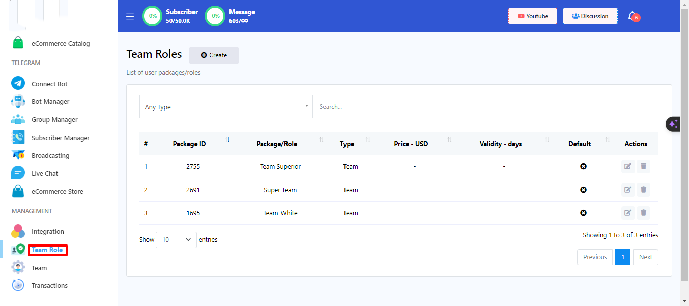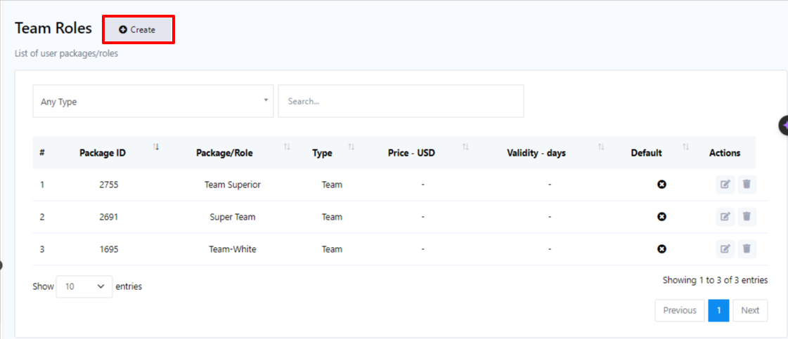3. Within the Team Role menu, click on the `Create` button.