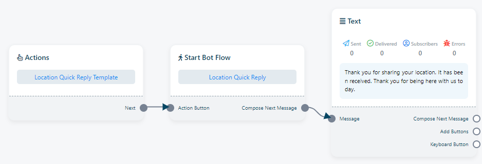 Location Reply: The `Location Reply` is another pre-set message template designed for situations where a bot receives a location or address from a user. Users can apply this Location Reply to any bot within their system.