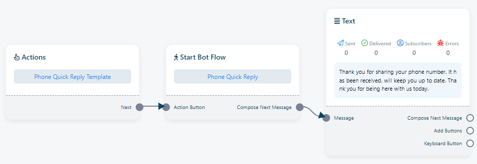 Phone Reply: `Phone Reply` is a pre-designed message template that can be deployed by when the bot receives a phone number from a subscriber. You have the flexibility to use this `Phone Reply` to any bot. This `Phone Reply` action button is also editable.