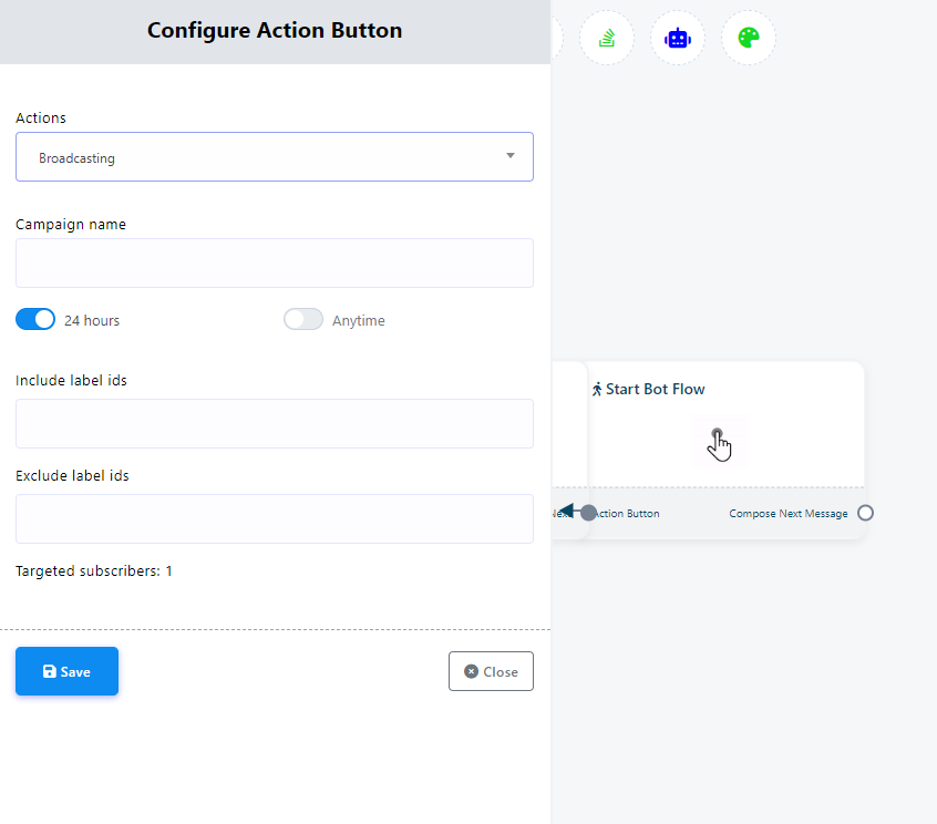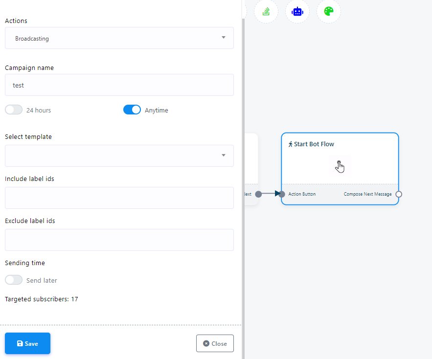 10. Finally, save the bot flow by clicking on the “Save” button on the Visual Flow Builder. The campaign will be created right after hitting the `Save` button.