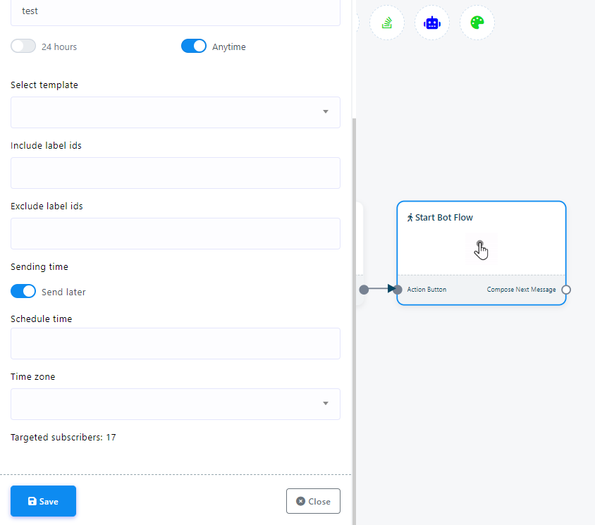 7. If you select `Anytime` then you will find some extra fields `Select template` and `Sending time`. Select a message template and hit the save button. If you want to schedule the broadcast campaign then select later and select your preferred time and then select the time zone.