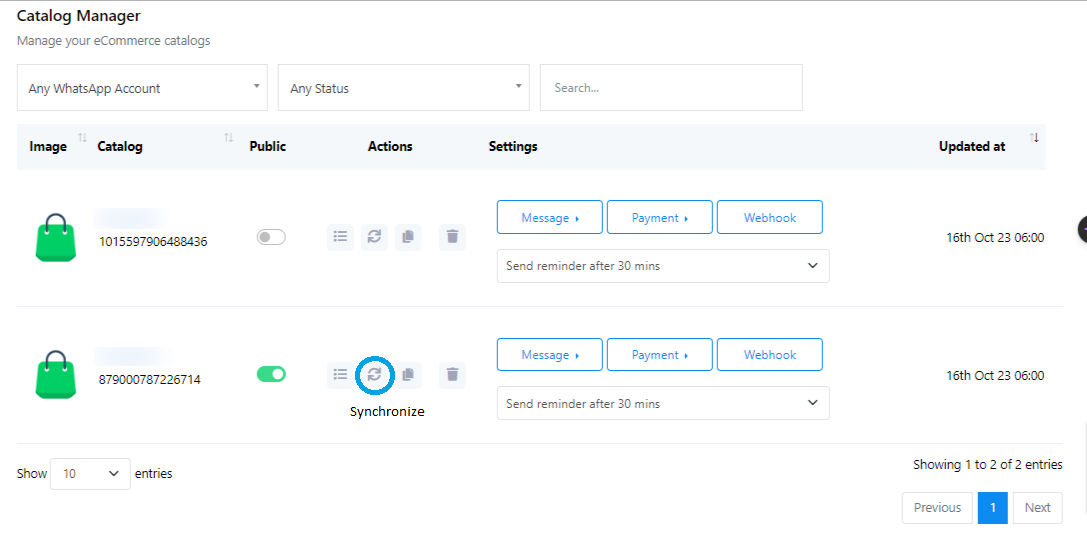 - Under `Actions`, you can view catalog products. Synchronize any added or updated products.